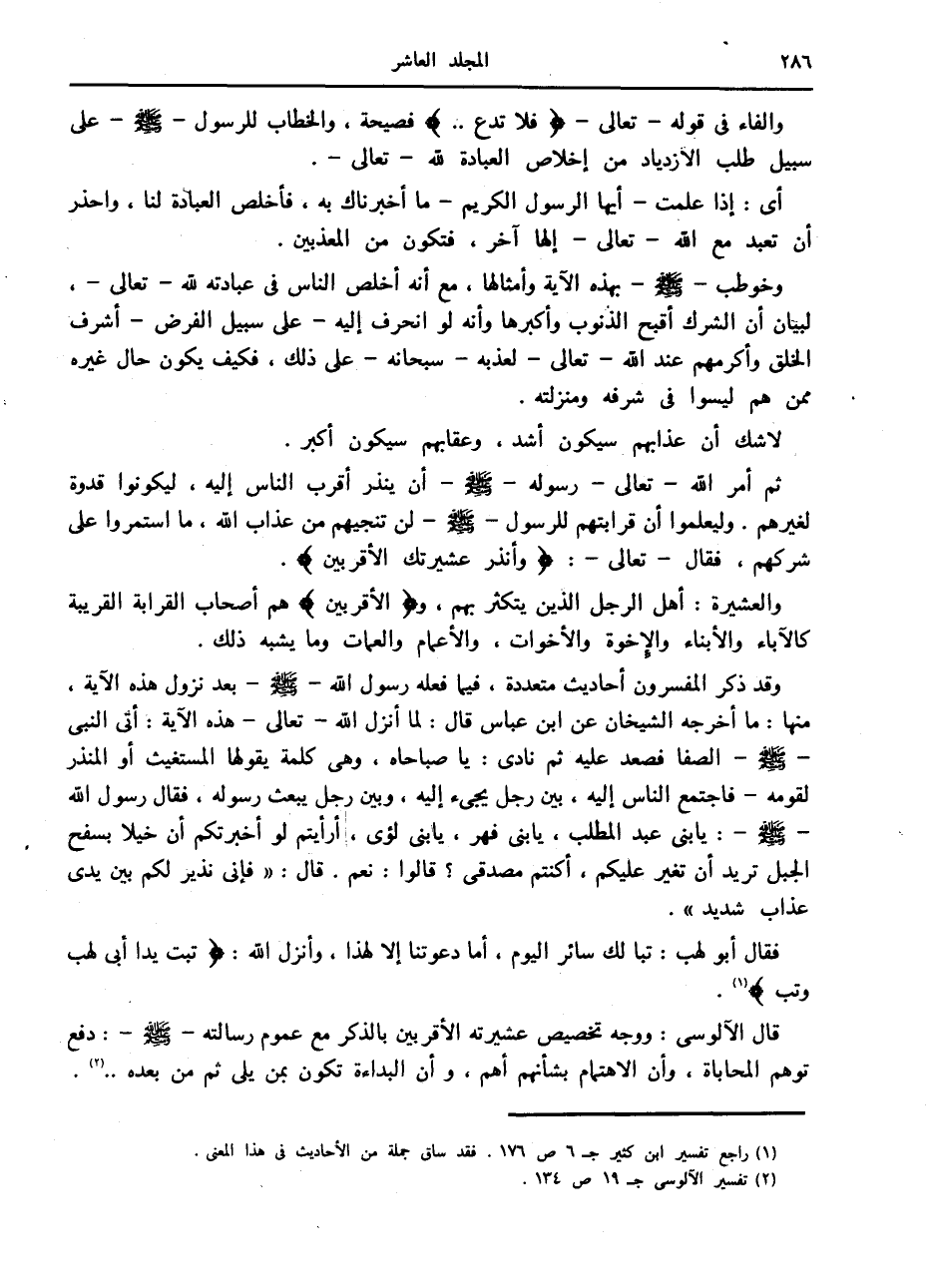 قال الآلوسى: ووجه تخصيص عشيرته الأقربين بالذكر مع عموم رسالته صلّى الله عليه وسلّم: دفع توهم المحاباة، وأن الاهتمام بشأنهم أهم، وأن البداءة تكون بمن يلي ثم من بعده.. «2» .
