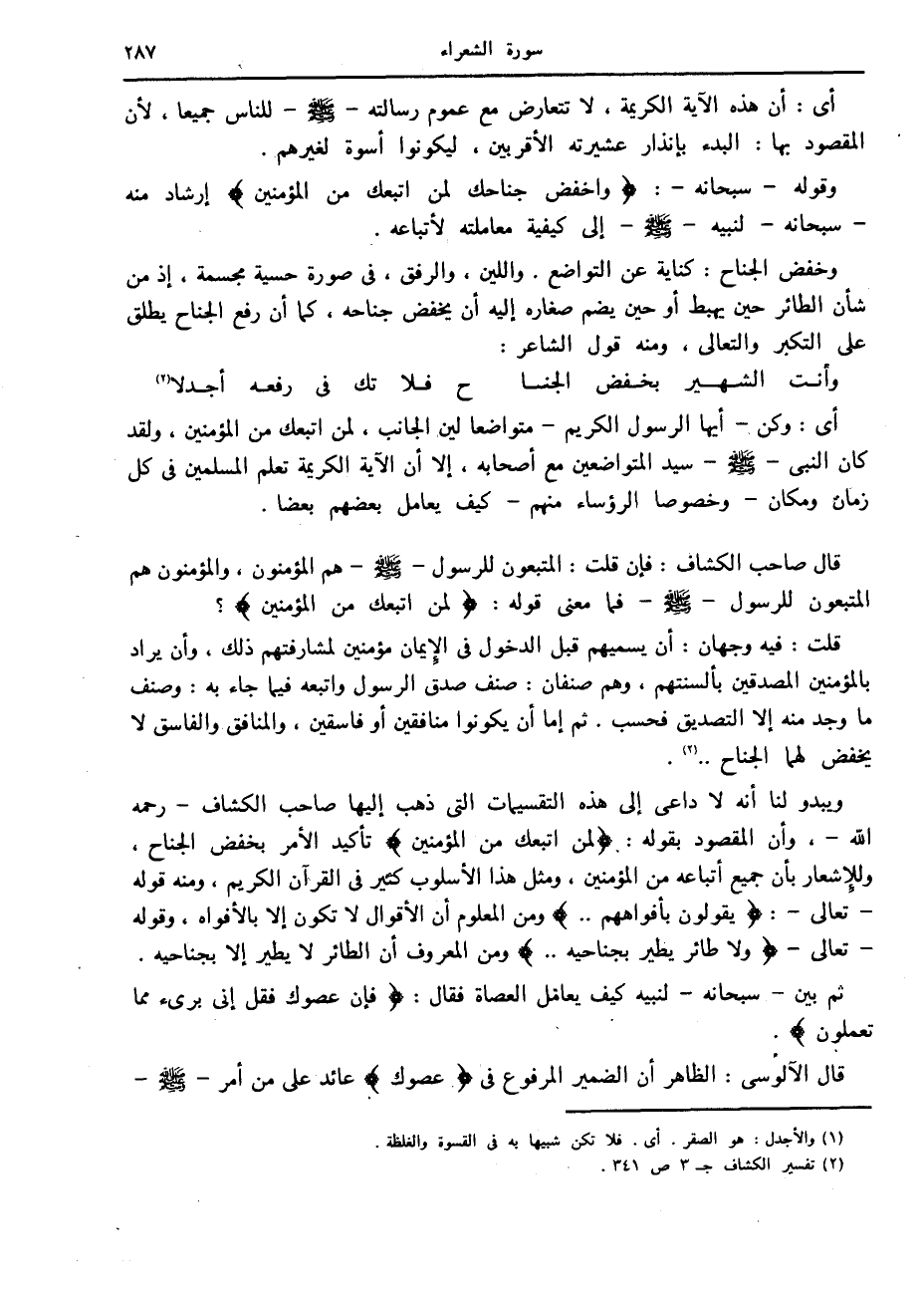 ويبدو لنا أنه لا داعي إلى هذه التقسيمات التي ذهب إليها صاحب الكشاف- رحمه الله-، وأن المقصود بقوله: لِمَنِ اتَّبَعَكَ مِنَ الْمُؤْمِنِينَ تأكيد الأمر بخفض الجناح، وللإشعار بأن جميع أتباعه من المؤمنين، ومثل هذا الأسلوب كثير في القرآن الكريم، ومنه قوله- تعالى-: يَقُولُونَ بِأَفْواهِهِمْ.. ومن المعلوم أن الأقوال لا تكون إلا بالأفواه، وقوله- تعالى- وَلا طائِرٍ يَطِيرُ بِجَناحَيْهِ.. ومن المعروف أن الطائر لا يطير إلا بجناحيه.