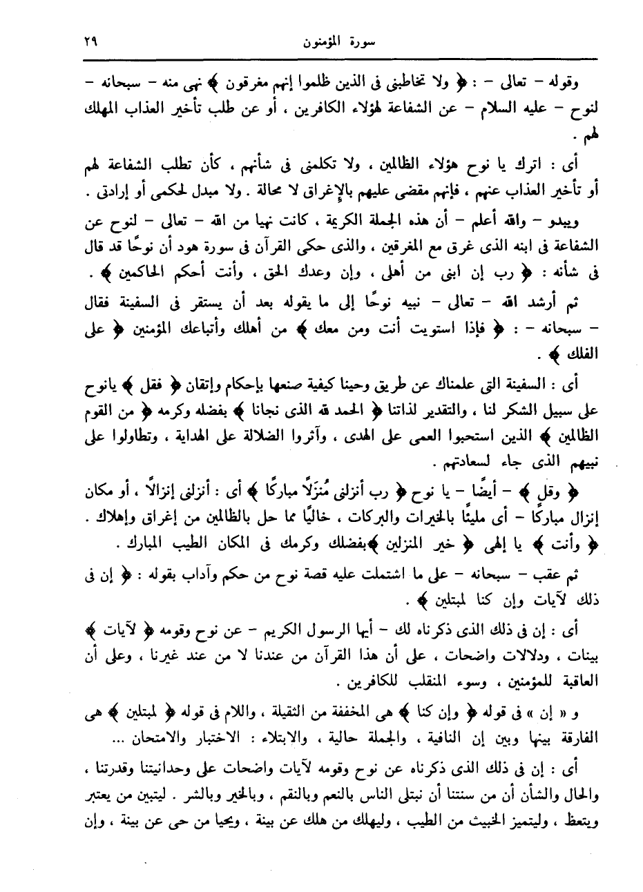 وقوله- تعالى-: وَلا تُخاطِبْنِي فِي الَّذِينَ ظَلَمُوا إِنَّهُمْ مُغْرَقُونَ نهى منه- سبحانه- لنوح- عليه السلام- عن الشفاعة لهؤلاء الكافرين، أو عن طلب تأخير العذاب المهلك لهم.