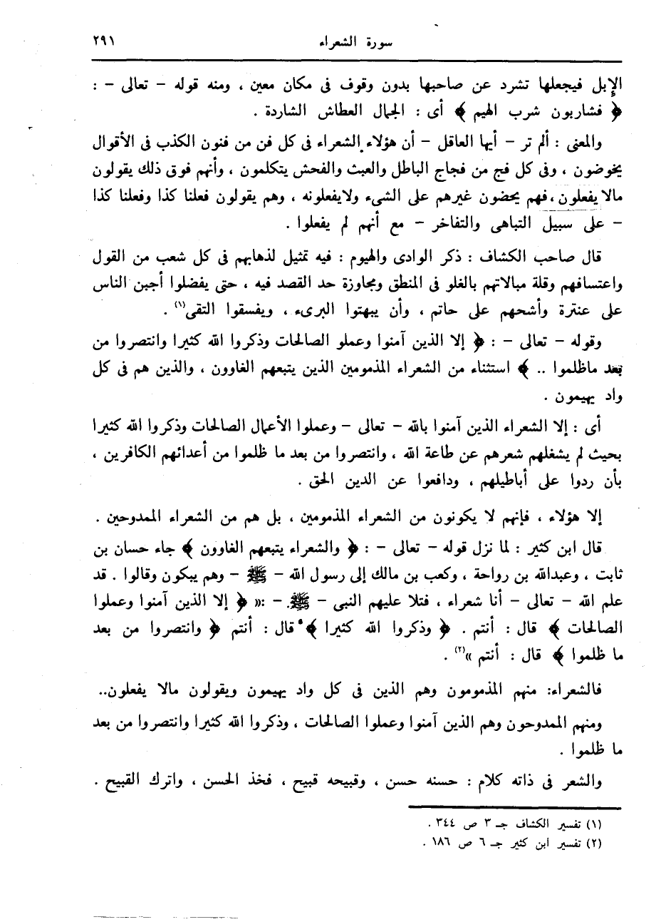 وقوله- تعالى-: إِلَّا الَّذِينَ آمَنُوا وَعَمِلُوا الصَّالِحاتِ وَذَكَرُوا اللَّهَ كَثِيراً وَانْتَصَرُوا مِنْ بَعْدِ ما ظُلِمُوا ... استثناء من الشعراء المذمومين الذين يتبعهم الغاوون، والذين هم في كل واد يهيمون.