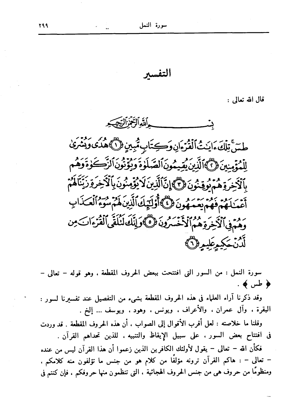 طس تِلْكَ آياتُ الْقُرْآنِ وَكِتابٍ مُبِينٍ (1) هُدىً وَبُشْرى لِلْمُؤْمِنِينَ (2) الَّذِينَ يُقِيمُونَ الصَّلاةَ وَيُؤْتُونَ الزَّكاةَ وَهُمْ بِالْآخِرَةِ هُمْ يُوقِنُونَ (3) إِنَّ الَّذِينَ لا يُؤْمِنُونَ بِالْآخِرَةِ زَيَّنَّا لَهُمْ أَعْمالَهُمْ فَهُمْ يَعْمَهُونَ (4)