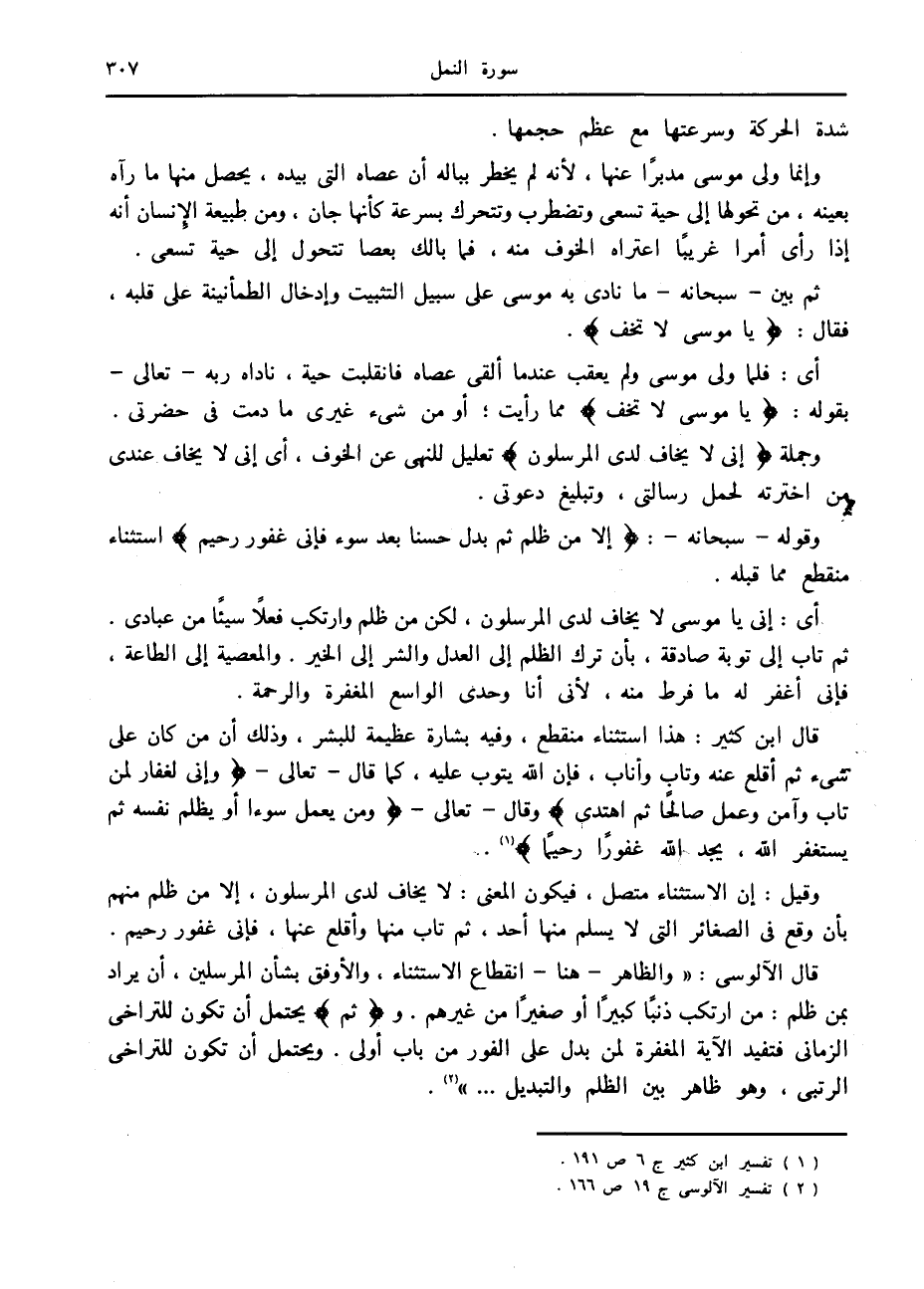 «1» وقيل: إن الاستثناء متصل، فيكون المعنى: لا يخاف لدى المرسلون، إلا من ظلم منهم بأن وقع في الصغائر التي لا يسلم منها أحد، ثم تاب منها وأقلع عنها، فإنى غفور رحيم.