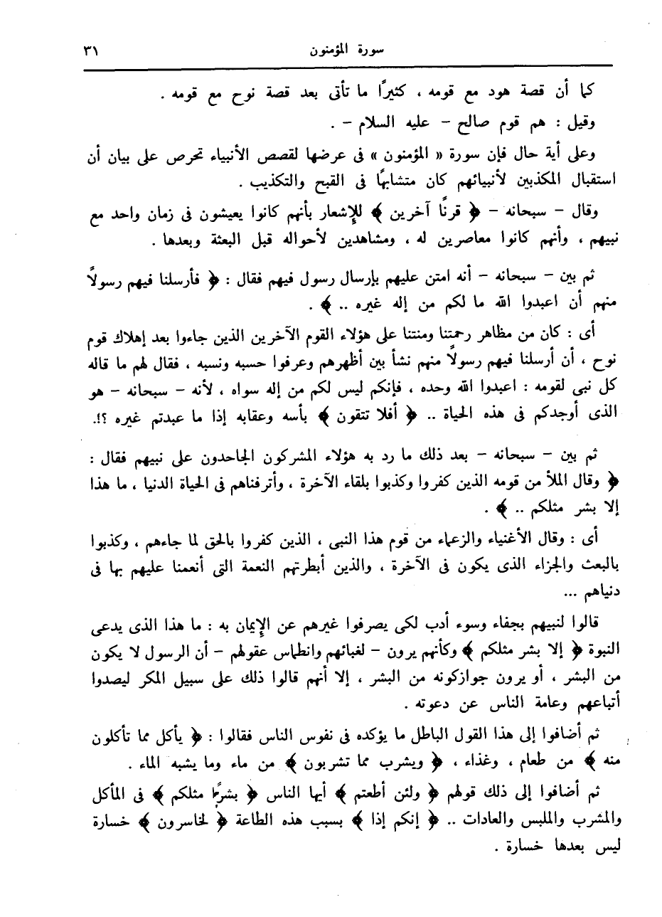 وعلى أية حال فإن سورة «المؤمنون» في عرضها لقصص الأنبياء تحرص على بيان أن استقبال المكذبين لأنبيائهم كان متشابها في القبح والتكذيب.