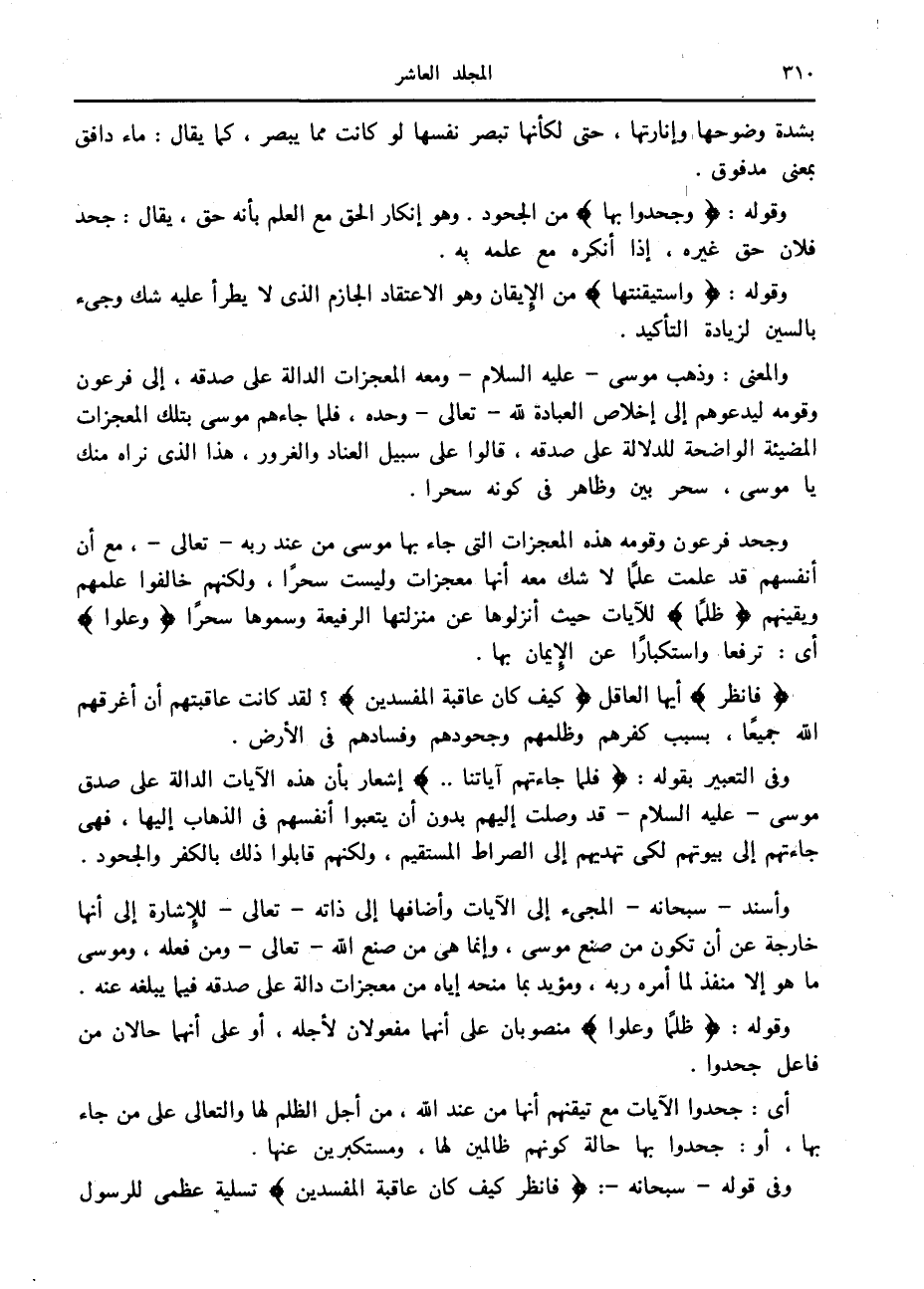 وجحد فرعون وقومه هذه المعجزات التي جاء بها موسى من عند ربه- تعالى-، مع أن أنفسهم قد علمت علما لا شك معه أنها معجزات وليست سحرا، ولكنهم خالفوا علمهم ويقينهم ظُلْماً للآيات حيث أنزلوها عن منزلتها الرفيعة وسموها سحرا وَعُلُوًّا أى: ترفعا واستكبارا عن الإيمان بها.