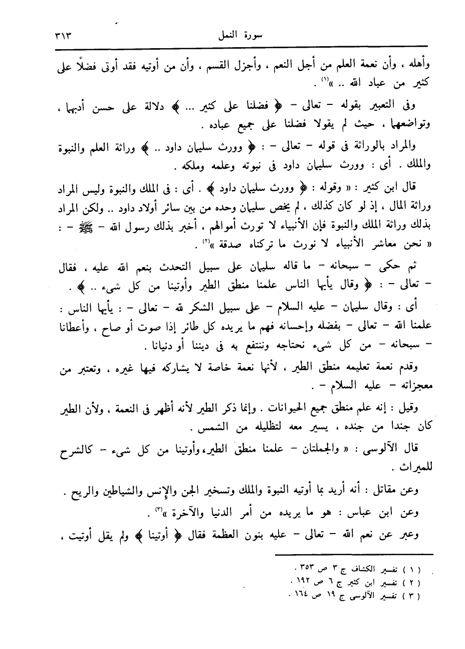 قال الآلوسى: «والجملتان- علمنا منطق الطير، وأوتينا من كل شيء- كالشرح للميراث.