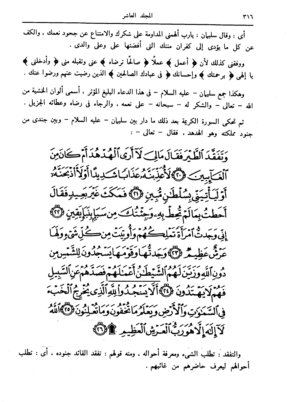 ثم تحكى السورة الكريمة بعد ذلك ما دار بين سليمان- عليه السلام- وبين جندي من جنود مملكته وهو الهدهد، فقال- تعالى-: