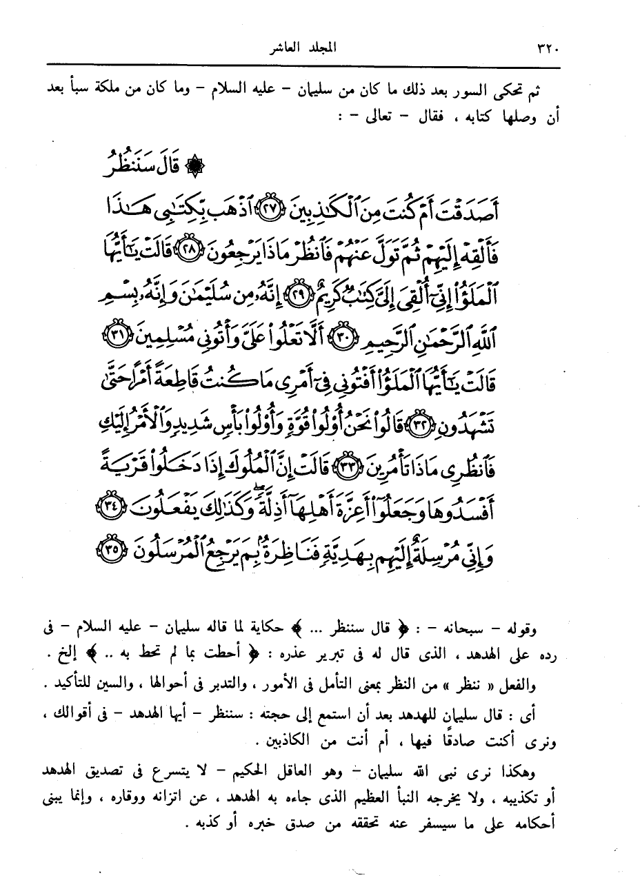 قالَ سَنَنْظُرُ أَصَدَقْتَ أَمْ كُنْتَ مِنَ الْكاذِبِينَ (27) اذْهَبْ بِكِتابِي هذا فَأَلْقِهْ إِلَيْهِمْ ثُمَّ تَوَلَّ عَنْهُمْ فَانْظُرْ ماذا يَرْجِعُونَ (28) قالَتْ يا أَيُّهَا الْمَلَأُ إِنِّي أُلْقِيَ إِلَيَّ كِتابٌ كَرِيمٌ (29) إِنَّهُ مِنْ سُلَيْمانَ وَإِنَّهُ بِسْمِ اللَّهِ الرَّحْمنِ الرَّحِيمِ (30) أَلاَّ تَعْلُوا عَلَيَّ وَأْتُونِي مُسْلِمِينَ (31)