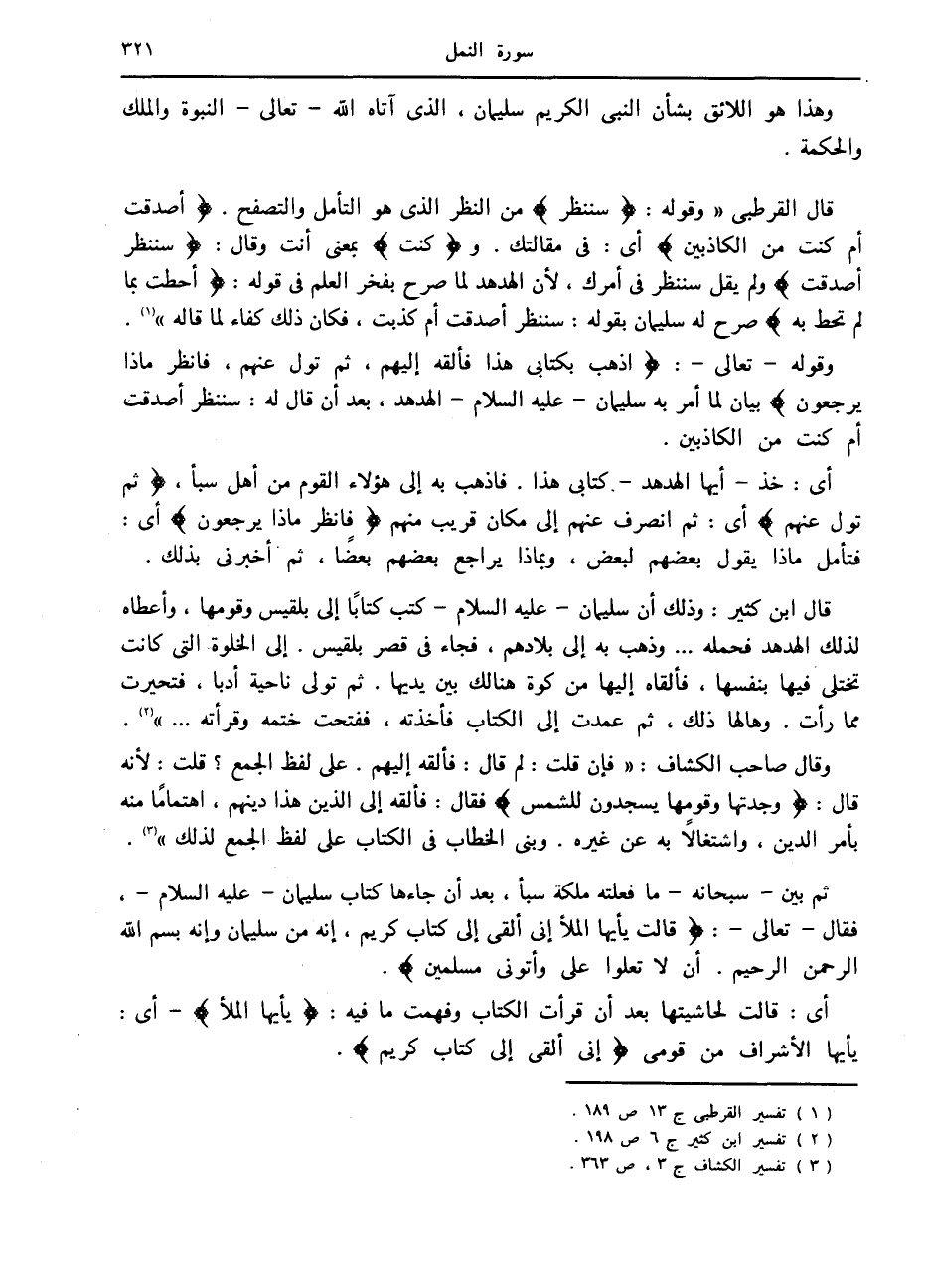 قال القرطبي «وقوله: سَنَنْظُرُ من النظر الذي هو التأمل والتصفح. أَصَدَقْتَ أَمْ كُنْتَ مِنَ الْكاذِبِينَ أى: في مقالتك. وكُنْتَ بمعنى أنت وقال: سَنَنْظُرُ أَصَدَقْتَ ولم يقل سننظر في أمرك، لأن الهدهد لما صرح بفخر العلم في قوله: أَحَطْتُ بِما لَمْ تُحِطْ بِهِ صرح له سليمان بقوله: سننظر أصدقت أم كذبت، فكان ذلك كفاء لما قاله» «1» .