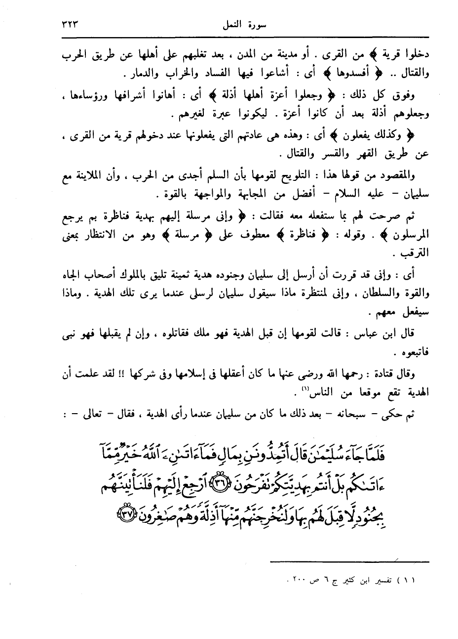 فَلَمَّا جاءَ سُلَيْمانَ قالَ أَتُمِدُّونَنِ بِمالٍ فَما آتانِيَ اللَّهُ خَيْرٌ مِمَّا آتاكُمْ بَلْ أَنْتُمْ بِهَدِيَّتِكُمْ تَفْرَحُونَ (36) ارْجِعْ إِلَيْهِمْ فَلَنَأْتِيَنَّهُمْ بِجُنُودٍ لا قِبَلَ لَهُمْ بِها وَلَنُخْرِجَنَّهُمْ مِنْها أَذِلَّةً وَهُمْ صاغِرُونَ (37)