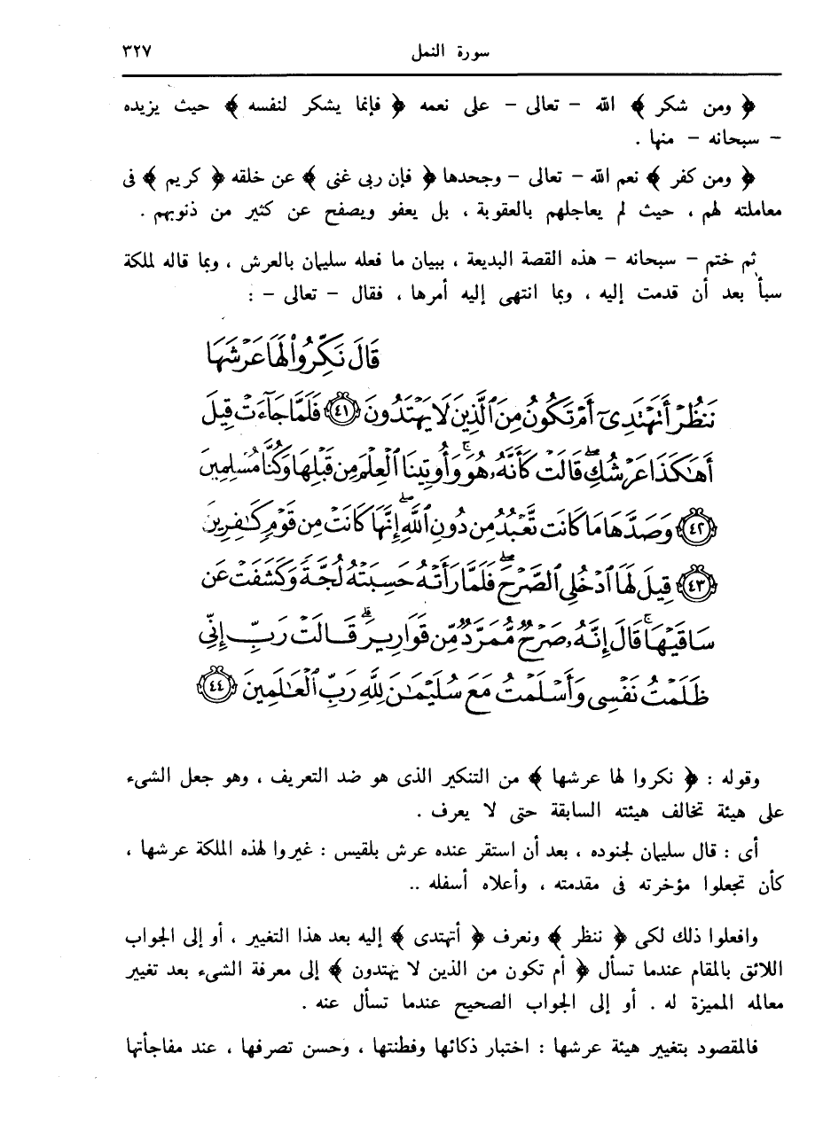 قالَ نَكِّرُوا لَها عَرْشَها نَنْظُرْ أَتَهْتَدِي أَمْ تَكُونُ مِنَ الَّذِينَ لا يَهْتَدُونَ (41) فَلَمَّا جاءَتْ قِيلَ أَهكَذا عَرْشُكِ قالَتْ كَأَنَّهُ هُوَ وَأُوتِينَا الْعِلْمَ مِنْ قَبْلِها وَكُنَّا مُسْلِمِينَ (42) وَصَدَّها ما كانَتْ تَعْبُدُ مِنْ دُونِ اللَّهِ إِنَّها كانَتْ مِنْ قَوْمٍ كافِرِينَ (43) قِيلَ لَهَا ادْخُلِي الصَّرْحَ فَلَمَّا رَأَتْهُ حَسِبَتْهُ لُجَّةً وَكَشَفَتْ عَنْ ساقَيْها قالَ إِنَّهُ صَرْحٌ مُمَرَّدٌ مِنْ قَوارِيرَ قالَتْ رَبِّ إِنِّي ظَلَمْتُ نَفْسِي وَأَسْلَمْتُ مَعَ سُلَيْمانَ لِلَّهِ رَبِّ الْعالَمِينَ (44)