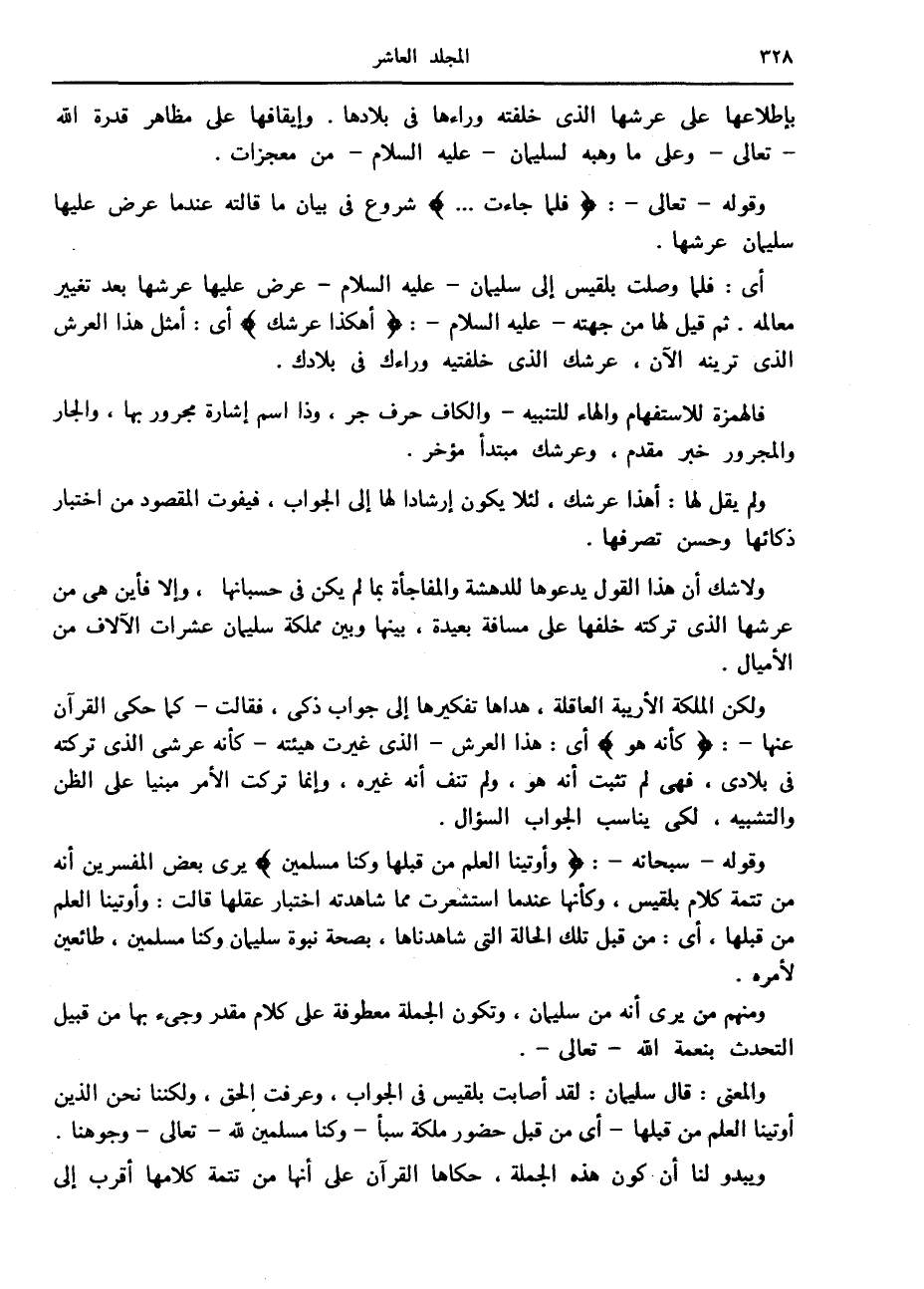 ولا شك أن هذا القول يدعوها للدهشة والمفاجأة بما لم يكن في حسبانها، وإلا فأين هي من عرشها الذي تركته خلفها على مسافة بعيدة، بينها وبين مملكة سليمان عشرات الآلاف من الأميال.