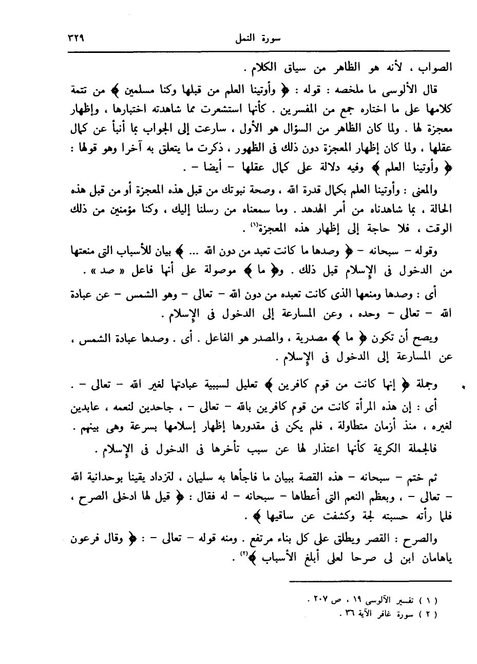 قال الآلوسي ما ملخصه: قوله: وَأُوتِينَا الْعِلْمَ مِنْ قَبْلِها وَكُنَّا مُسْلِمِينَ من تتمة كلامها على ما اختاره جمع من المفسرين. كأنها استشعرت مما شاهدته اختبارها، وإظهار معجزة لها. ولما كان الظاهر من السؤال هو الأول، سارعت إلى الجواب بما أنبأ عن كمال عقلها، ولما كان إظهار المعجزة دون ذلك في الظهور، ذكرت ما يتعلق به آخرا وهو قولها: