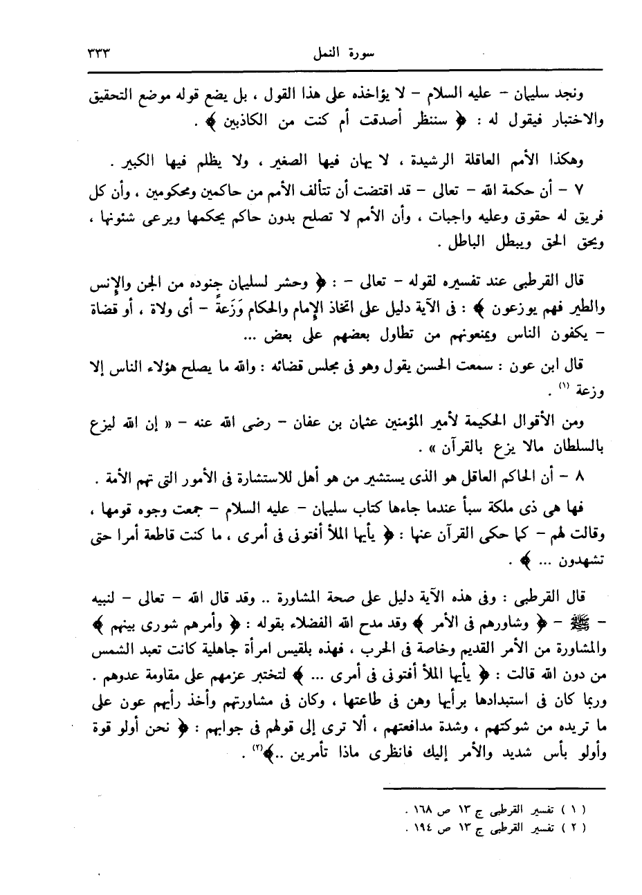 قال القرطبي: وفي هذه الآية دليل على صحة المشاورة.. وقد قال الله- تعالى- لنبيه صلّى الله عليه وسلم وَشاوِرْهُمْ فِي الْأَمْرِ وقد مدح الله الفضلاء بقوله: وَأَمْرُهُمْ شُورى بَيْنَهُمْ والمشاورة من الأمر القديم وخاصة في الحرب، فهذه بلقيس امرأة جاهلية كانت تعبد الشمس من دون الله قالت: يا أَيُّهَا الْمَلَأُ أَفْتُونِي فِي أَمْرِي ... لتختبر عزمهم على مقاومة عدوهم.