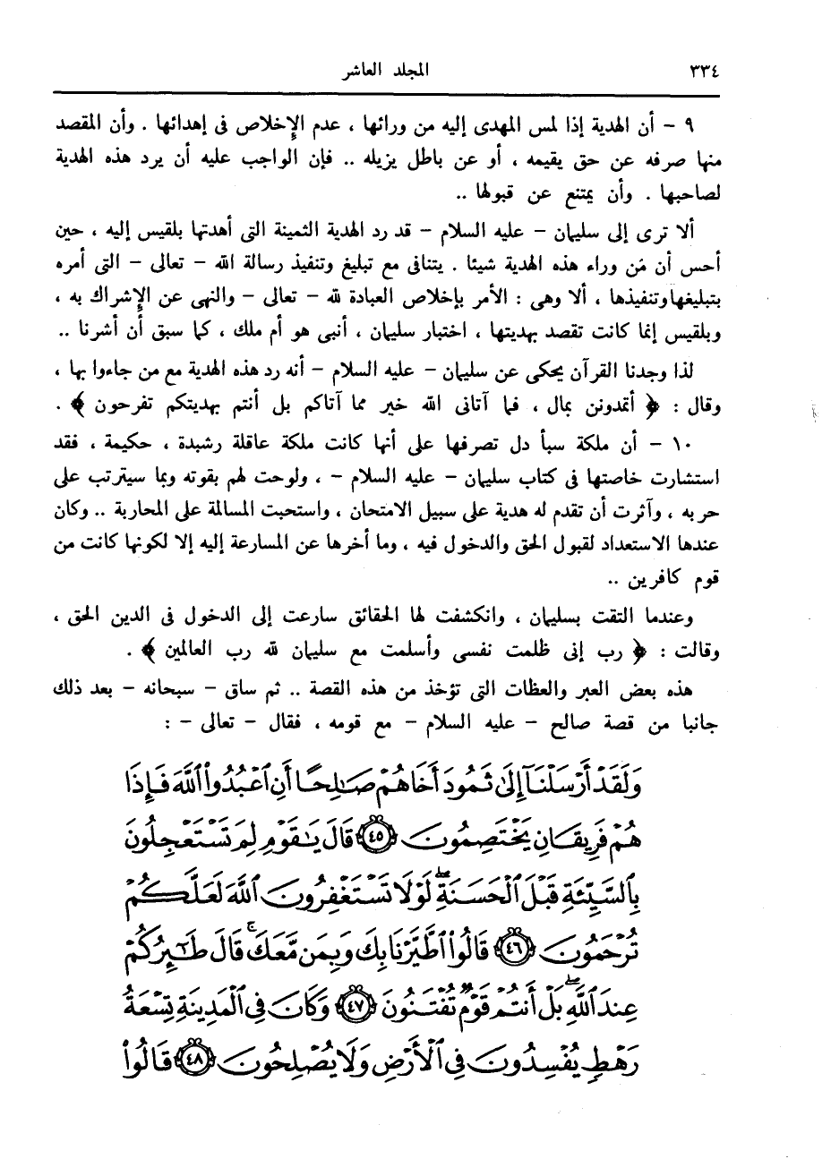 ألا ترى إلى سليمان- عليه السلام- قد رد الهدية الثمينة التي أهدتها بلقيس إليه، حين أحس أن من وراء هذه الهدية شيئا. يتنافى مع تبليغ وتنفيذ رسالة الله- تعالى- التي أمره بتبليغها وتنفيذها، ألا وهي: الأمر بإخلاص العبادة لله- تعالى- والنهى عن الإشراك به، وبلقيس إنما كانت تقصد بهديتها، اختبار سليمان، أنبى هو أم ملك، كما سبق أن أشرنا..
