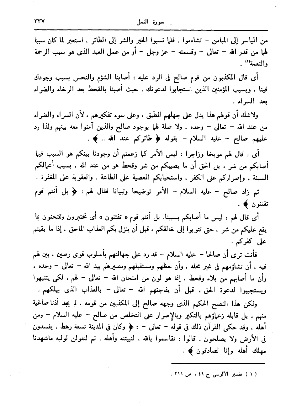 فأنت ترى أن صالحا- عليه السلام- قد رد على جهالتهم بأسلوب قوى رصين، بين لهم فيه، أن تشاؤمهم في غير محله، وأن حظهم ومستقبلهم ومصيرهم بيد الله- تعالى- وحده، وأن ما أصابهم من بلاء وقحط، إنما هو لون من امتحان الله- تعالى- لهم، لكي يتنبهوا ويستجيبوا لدعوة الحق، قبل أن يفاجئهم الله- تعالى- بالعذاب الذي يهلكهم.