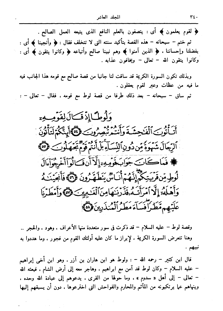 وَلُوطاً إِذْ قالَ لِقَوْمِهِ أَتَأْتُونَ الْفاحِشَةَ وَأَنْتُمْ تُبْصِرُونَ (54) أَإِنَّكُمْ لَتَأْتُونَ الرِّجالَ شَهْوَةً مِنْ دُونِ النِّساءِ بَلْ أَنْتُمْ قَوْمٌ تَجْهَلُونَ (55) فَما كانَ جَوابَ قَوْمِهِ إِلاَّ أَنْ قالُوا أَخْرِجُوا آلَ لُوطٍ مِنْ قَرْيَتِكُمْ إِنَّهُمْ أُناسٌ يَتَطَهَّرُونَ (56) فَأَنْجَيْناهُ وَأَهْلَهُ إِلاَّ امْرَأَتَهُ قَدَّرْناها مِنَ الْغابِرِينَ (57) وَأَمْطَرْنا عَلَيْهِمْ مَطَراً فَساءَ مَطَرُ الْمُنْذَرِينَ (58)