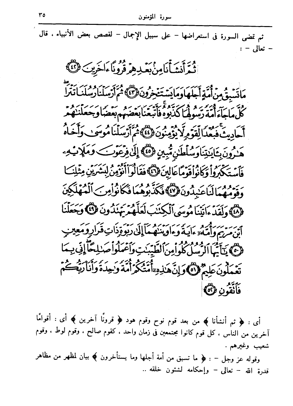 ثُمَّ أَنْشَأْنا مِنْ بَعْدِهِمْ قُرُوناً آخَرِينَ (42) ما تَسْبِقُ مِنْ أُمَّةٍ أَجَلَها وَما يَسْتَأْخِرُونَ (43) ثُمَّ أَرْسَلْنا رُسُلَنا تَتْرا كُلَّ ما جاءَ أُمَّةً رَسُولُها كَذَّبُوهُ فَأَتْبَعْنا بَعْضَهُمْ بَعْضاً وَجَعَلْناهُمْ أَحادِيثَ فَبُعْداً لِقَوْمٍ لا يُؤْمِنُونَ (44) ثُمَّ أَرْسَلْنا مُوسى وَأَخاهُ هارُونَ بِآياتِنا وَسُلْطانٍ مُبِينٍ (45) إِلى فِرْعَوْنَ وَمَلائِهِ فَاسْتَكْبَرُوا وَكانُوا قَوْماً عالِينَ (46)