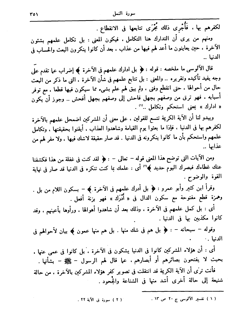 ويبدو لنا أن الآية الكريمة تتسع للقولين، على معنى أن المشركين اضمحل علمهم بالآخرة لكفرهم بها في الدنيا، فإذا ما بعثوا يوم القيامة وشاهدوا العذاب، أيقنوا بحقيقتها، وتكامل علمهم واستحكم بأن ما كانوا ينكرونه في الدنيا. قد صار حقيقة لا شك فيها، ولا مفر لهم من عذابها..