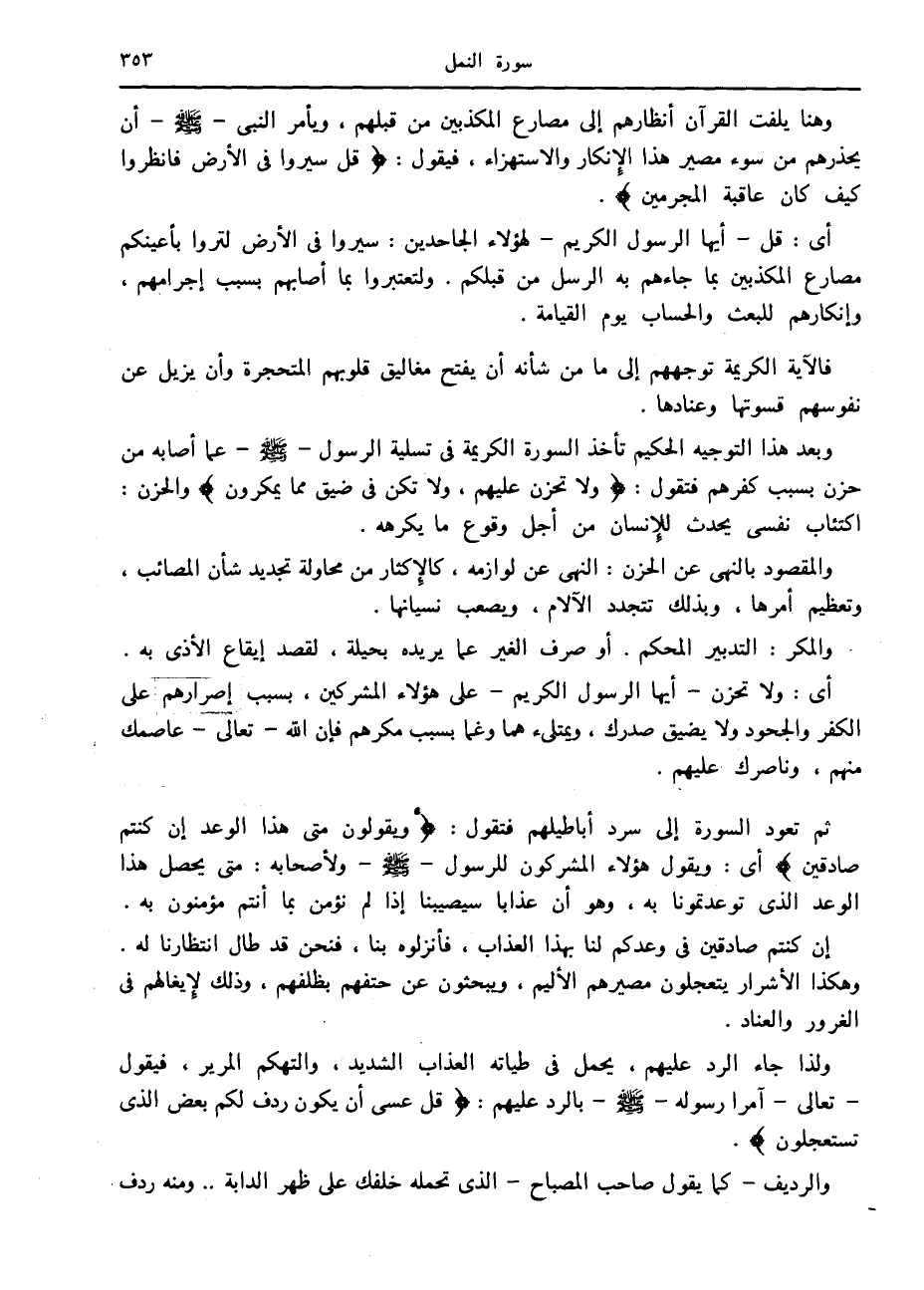 وبعد هذا التوجيه الحكيم تأخذ السورة الكريمة في تسلية الرسول صلّى الله عليه وسلم عما أصابه من حزن بسبب كفرهم فتقول: وَلا تَحْزَنْ عَلَيْهِمْ، وَلا تَكُنْ فِي ضَيْقٍ مِمَّا يَمْكُرُونَ والحزن: