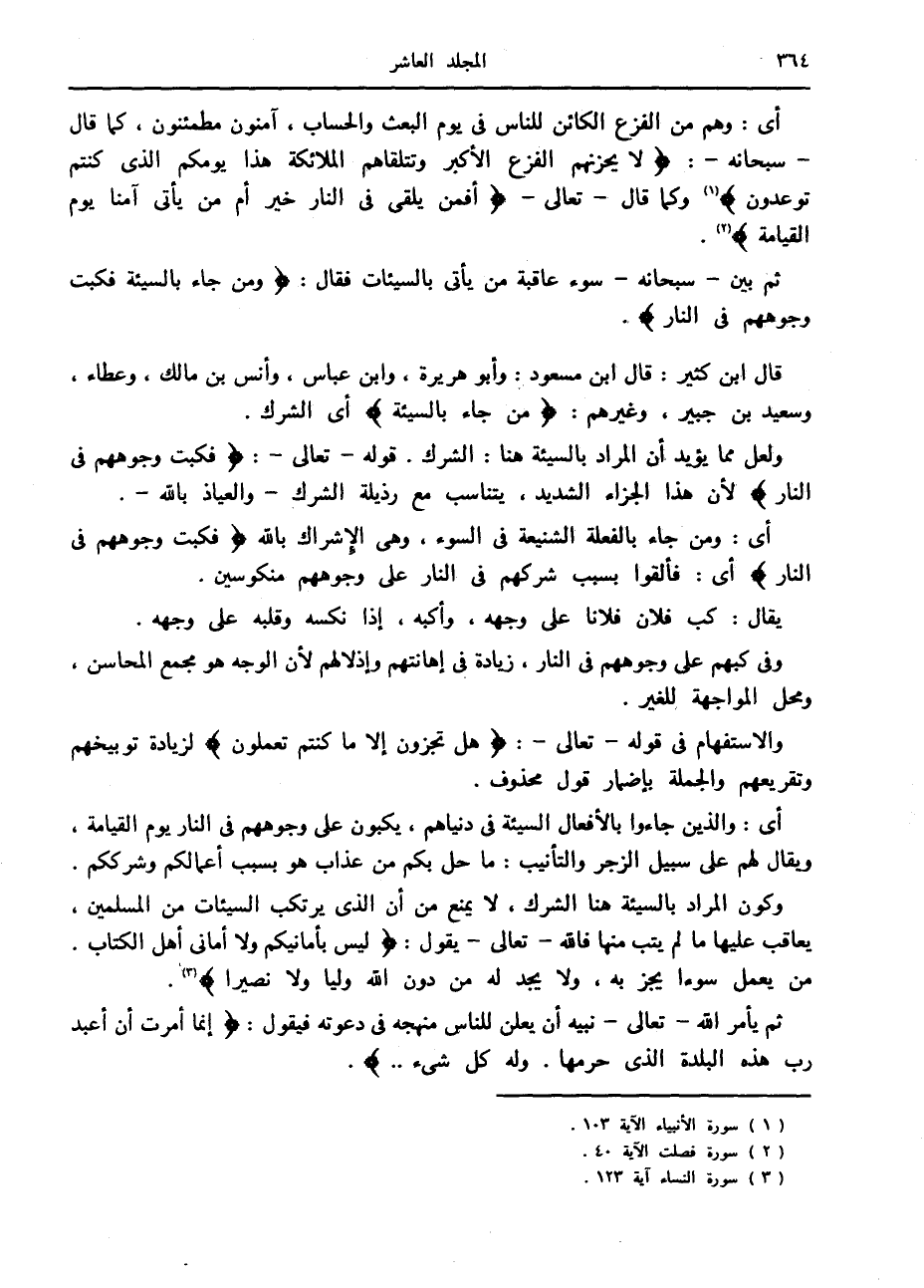 ولعل مما يؤيد أن المراد بالسيئة هنا: الشرك. قوله- تعالى-: فَكُبَّتْ وُجُوهُهُمْ فِي النَّارِ لأن هذا الجزاء الشديد، يتناسب مع رذيلة الشرك- والعياذ بالله-.
