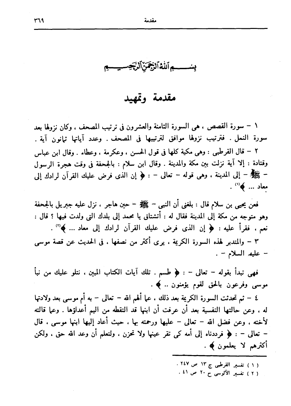 1- سورة القصص، هي السورة الثامنة والعشرون في ترتيب المصحف، وكان نزولها بعد سورة النمل. فترتيب نزولها موافق لترتيبها في المصحف. وعدد آياتها ثمانون آية.