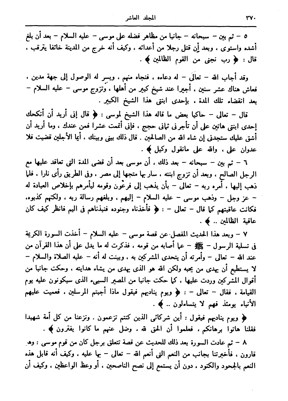 6- ثم بين- سبحانه- بعد ذلك، أن موسى بعد أن قضى المدة التي تعاقد عليها مع الرجل الصالح، وبعد أن تزوج ابنته، سار بها متجها إلى مصر، وفي الطريق رأى نارا، فلما ذهب إليها، أمره ربه- تعالى- بأن يذهب إلى فرعون وقومه ليأمرهم بإخلاص العبادة له- عز وجل- وذهب موسى- عليه السلام- إليهم، وبلغهم رسالة ربه، ولكنهم كذبوه، فكانت عاقبتهم كما قال- تعالى-: فَأَخَذْناهُ وَجُنُودَهُ فَنَبَذْناهُمْ فِي الْيَمِّ فَانْظُرْ كَيْفَ كانَ عاقِبَةُ الظَّالِمِينَ ...