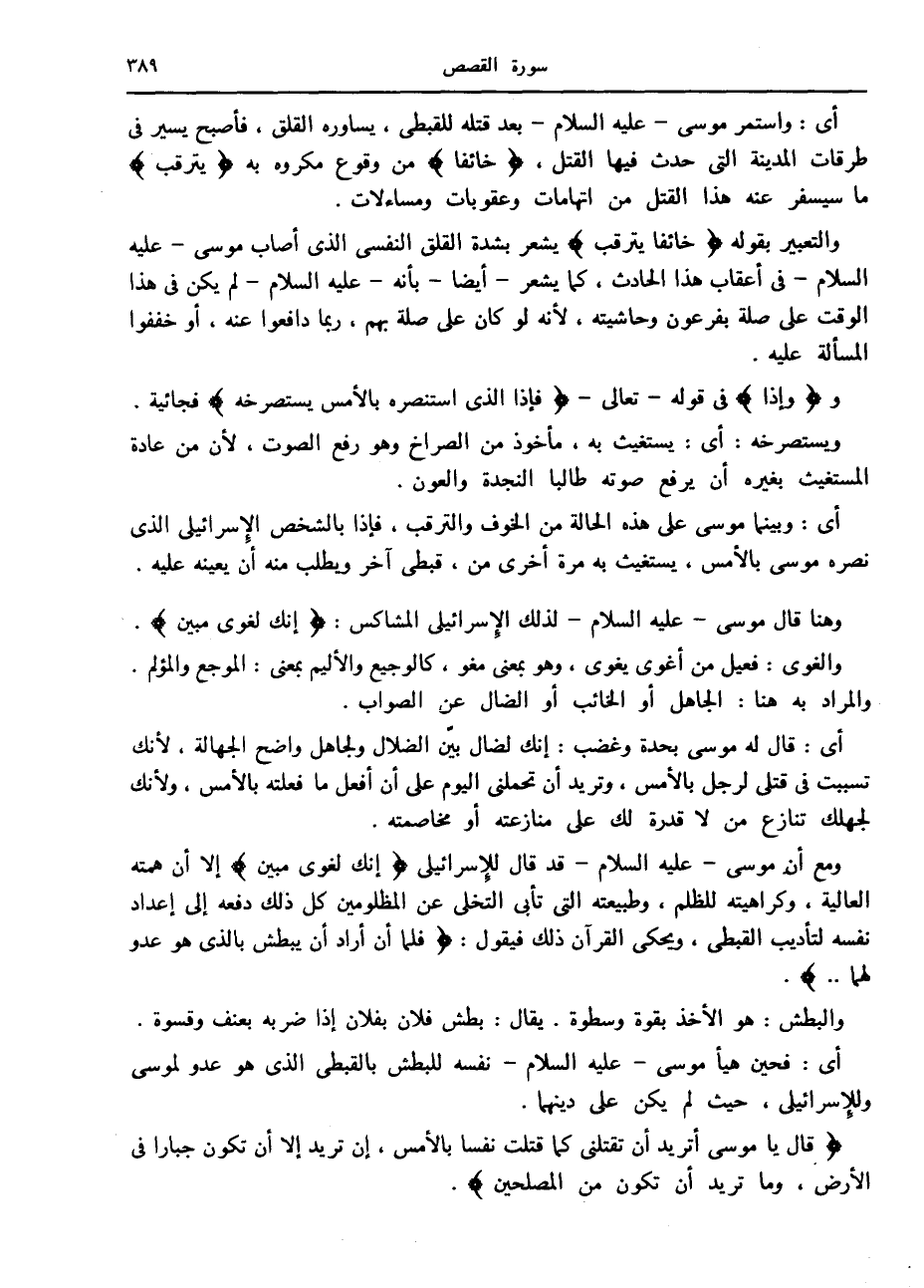 ومع أن موسى- عليه السلام- قد قال للإسرائيلى إِنَّكَ لَغَوِيٌّ مُبِينٌ إلا أن همته العالية، وكراهيته للظلم، وطبيعته التي تأبى التخلي عن المظلومين كل ذلك دفعه إلى إعداد نفسه لتأديب القبطي، ويحكى القرآن ذلك فيقول: فَلَمَّا أَنْ أَرادَ أَنْ يَبْطِشَ بِالَّذِي هُوَ عَدُوٌّ لَهُما ...