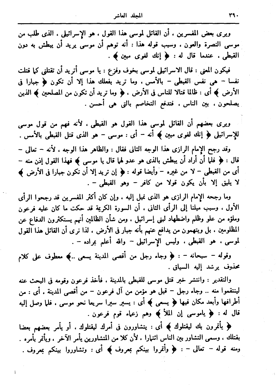 وقد رجح الإمام الرازي هذا الوجه الثاني فقال: والظاهر هذا الوجه، لأنه- تعالى- قال: فَلَمَّا أَنْ أَرادَ أَنْ يَبْطِشَ بِالَّذِي هُوَ عَدُوٌّ لَهُما قالَ يا مُوسى فهذا القول إذن منه- أى من القبطي- لا من غيره- وأيضا قوله: إِنْ تُرِيدُ إِلَّا أَنْ تَكُونَ جَبَّاراً فِي الْأَرْضِ لا يليق إلا بأن يكون قولا من كافر- وهو القبطي-.