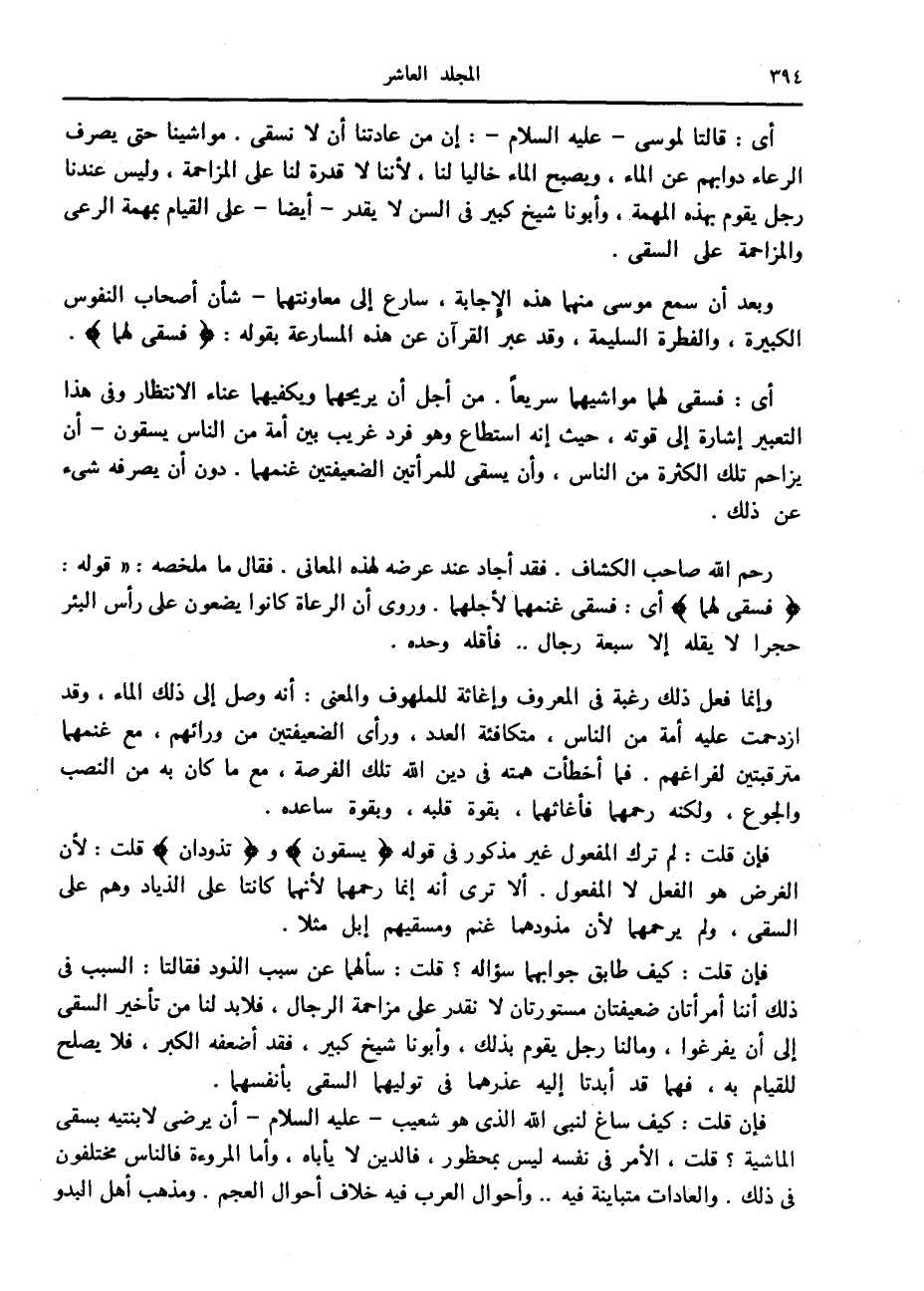 فإن قلت: كيف ساغ لنبي الله الذي هو شعيب- عليه السلام- أن يرضى لا بنتيه بسقى الماشية؟ قلت، الأمر في نفسه ليس بمحظور، فالدين لا يأباه، وأما المروءة فالناس مختلفون في ذلك. والعادات متباينة فيه.. وأحوال العرب فيه خلاف أحوال العجم. ومذهب أهل البدو