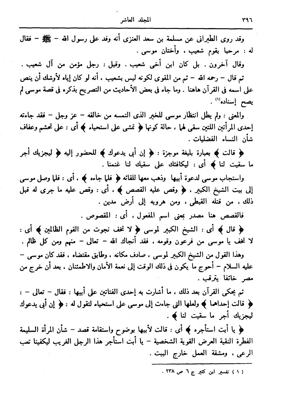 ثم قال- رحمه الله- ثم من المقوى لكونه ليس بشعيب، أنه لو كان إياه لأوشك أن ينص على اسمه في القرآن هاهنا. وما جاء في بعض الأحاديث من التصريح بذكره في قصة موسى لم يصح إسناده «1» .