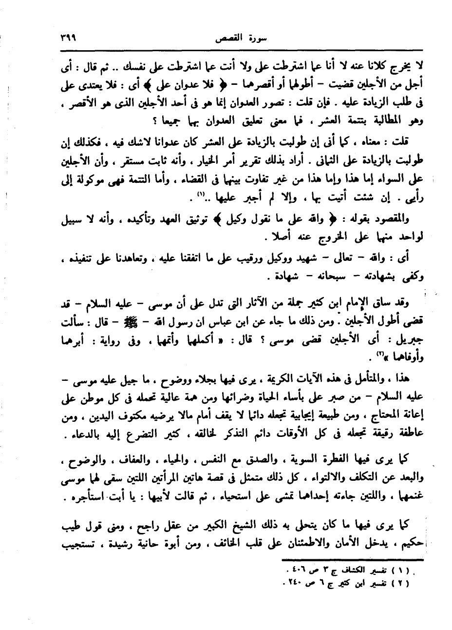 وقد ساق الإمام ابن كثير جملة من الآثار التي تدل على أن موسى- عليه السلام- قد قضى أطول الأجلين. ومن ذلك ما جاء عن ابن عباس أن رسول الله صلّى الله عليه وسلّم قال: سألت جبريل: أى الأجلين قضى موسى؟ قال: «أكملهما وأتمهما، وفي رواية: أبرهما وأوفاهما» «2» .