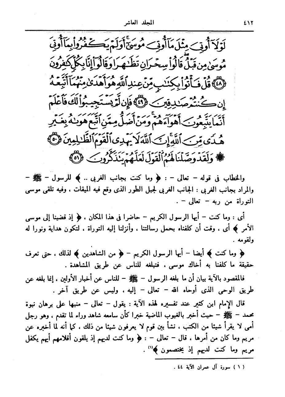 والخطاب في قوله- تعالى-: وَما كُنْتَ بِجانِبِ الْغَرْبِيِّ.. للرسول صلّى الله عليه وسلم والمراد بجانب الغربي: الجانب الغربي لجبل الطور الذي وقع فيه الميقات، وفيه تلقى موسى التوراة من ربه- تعالى-.