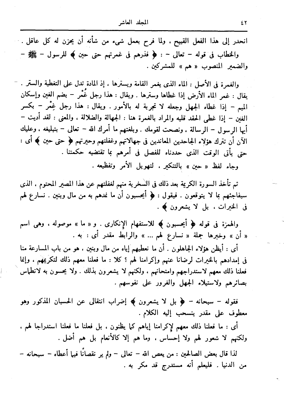 ثم تأخذ السورة الكريمة بعد ذلك في السخرية منهم لغفلتهم عن هذا المصير المحتوم، الذي سيفاجئهم بما لا يتوقعون. فيقول: أَيَحْسَبُونَ أَنَّما نُمِدُّهُمْ بِهِ مِنْ مالٍ وَبَنِينَ. نُسارِعُ لَهُمْ فِي الْخَيْراتِ، بَلْ لا يَشْعُرُونَ.