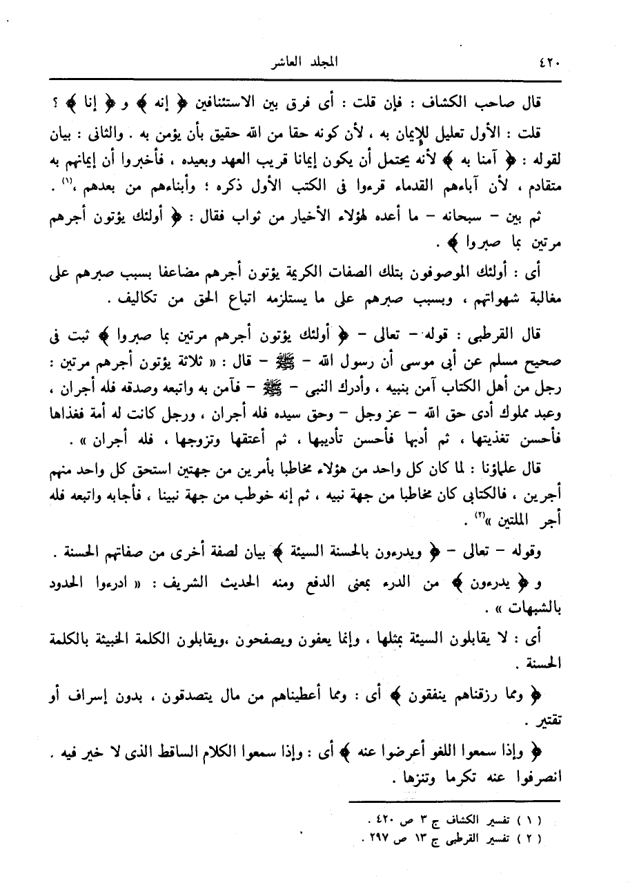 قال القرطبي: قوله- تعالى- أُولئِكَ يُؤْتَوْنَ أَجْرَهُمْ مَرَّتَيْنِ بِما صَبَرُوا ثبت في صحيح مسلم عن أبى موسى أن رسول الله صلّى الله عليه وسلّم قال: «ثلاثة يؤتون أجرهم مرتين: