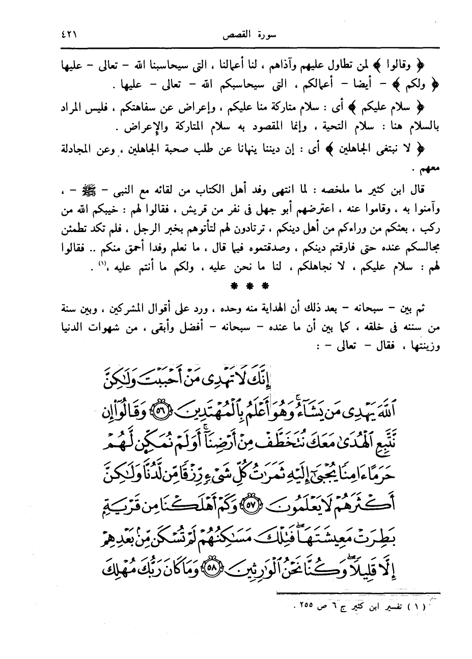 قال ابن كثير ما ملخصه: لما انتهى وقد أهل الكتاب من لقائه مع النبي صلّى الله عليه وسلم، وآمنوا به، وقاموا عنه، اعترضهم أبو جهل في نفر من قريش، فقالوا لهم: خيبكم الله من ركب، بعثكم من وراءكم من أهل دينكم، ترتادون لهم لتأتوهم بخبر الرجل، فلم تكد تطمئن مجالسكم عنده حتى فارقتم دينكم، وصدقتموه فيما قال، ما نعلم وفدا أحمق منكم.. فقالوا لهم: سلام عليكم، لا نجاهلكم، لنا ما نحن عليه، ولكم ما أنتم عليه، «1» .