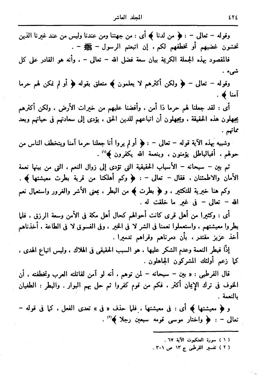 قال القرطبي: «بين- سبحانه- لمن توهم، أنه لو آمن لقاتلته العرب وتخطفته، أن الخوف في ترك الإيمان أكثر، فكم من قوم كفروا ثم حل بهم البوار. والبطر: الطغيان بالنعمة» .