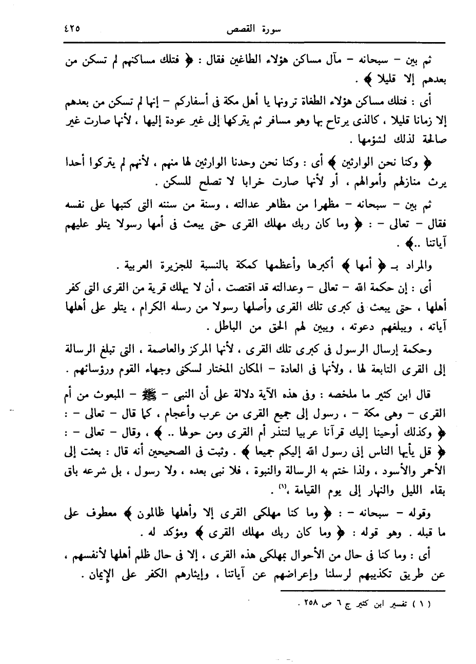ثم بين- سبحانه- مظهرا من مظاهر عدالته، وسنة من سننه التي كتبها على نفسه فقال- تعالى-: وَما كانَ رَبُّكَ مُهْلِكَ الْقُرى حَتَّى يَبْعَثَ فِي أُمِّها رَسُولًا يَتْلُوا عَلَيْهِمْ آياتِنا ...