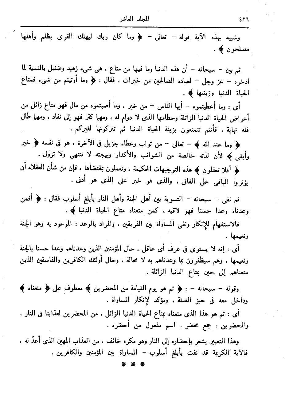 ثم نفى- سبحانه- التسوية بين أهل الجنة وأهل النار بأبلغ أسلوب فقال: أَفَمَنْ وَعَدْناهُ وَعْداً حَسَناً فَهُوَ لاقِيهِ، كَمَنْ مَتَّعْناهُ مَتاعَ الْحَياةِ الدُّنْيا.
