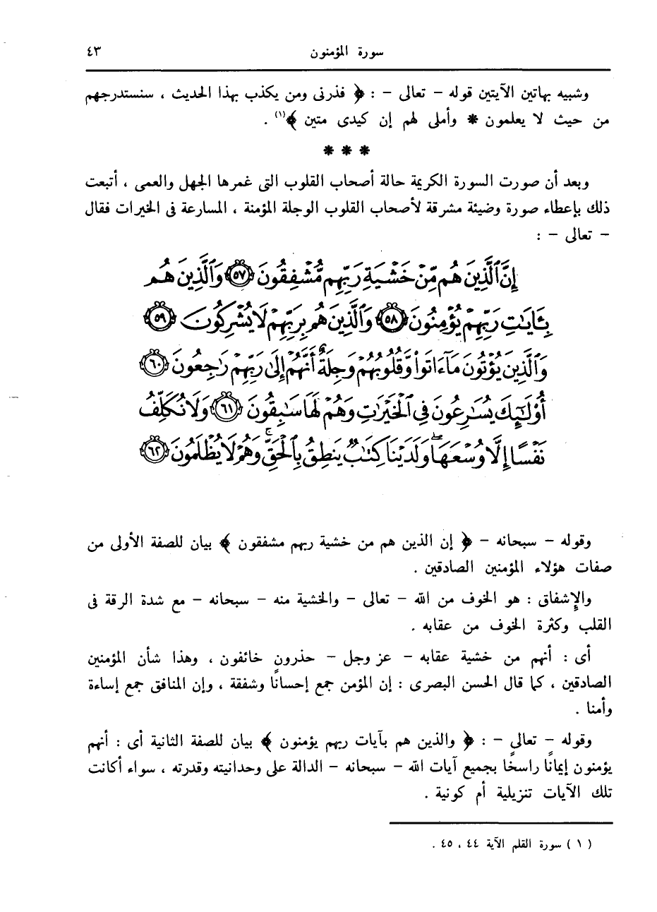 إِنَّ الَّذِينَ هُمْ مِنْ خَشْيَةِ رَبِّهِمْ مُشْفِقُونَ (57) وَالَّذِينَ هُمْ بِآياتِ رَبِّهِمْ يُؤْمِنُونَ (58) وَالَّذِينَ هُمْ بِرَبِّهِمْ لا يُشْرِكُونَ (59) وَالَّذِينَ يُؤْتُونَ ما آتَوْا وَقُلُوبُهُمْ وَجِلَةٌ أَنَّهُمْ إِلى رَبِّهِمْ راجِعُونَ (60) أُولئِكَ يُسارِعُونَ فِي الْخَيْراتِ وَهُمْ لَها سابِقُونَ (61)