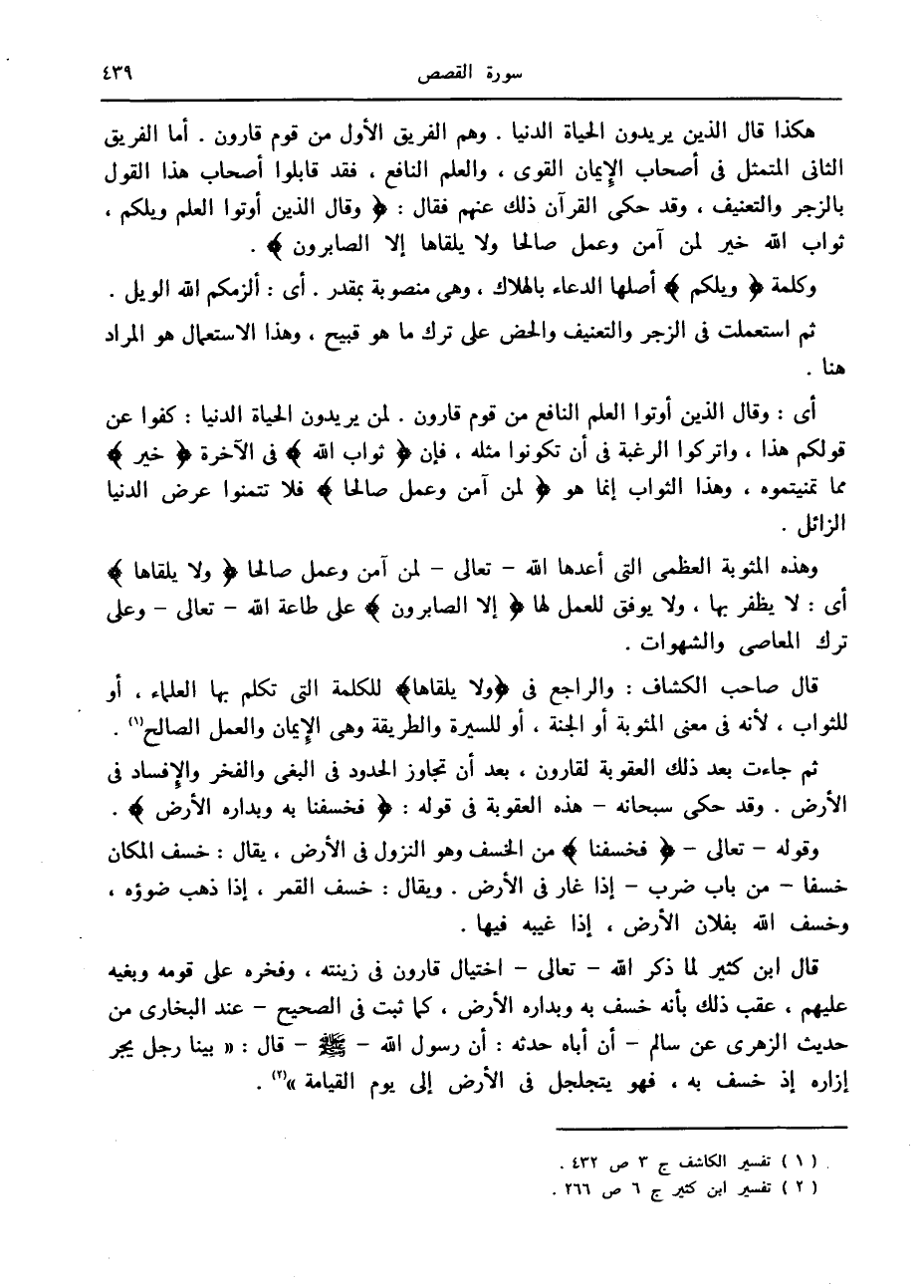قال ابن كثير لما ذكر الله- تعالى- اختيال قارون في زينته، وفخره على قومه وبغيه عليهم، عقب ذلك بأنه خسف به وبداره الأرض، كما ثبت في الصحيح- عند البخاري من حديث الزهري عن سالم- أن أباه حدثه: أن رسول الله صلّى الله عليه وسلّم قال: «بينا رجل يجر إزاره إذ خسف به، فهو يتجلجل في الأرض إلى يوم القيامة» «2» .