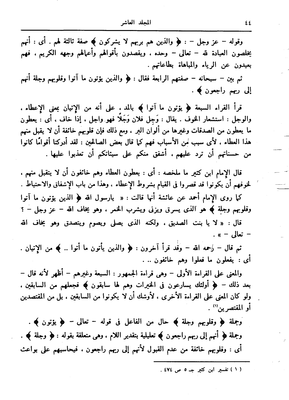 قال الإمام ابن كثير ما ملخصه: أى: يعطون العطاء وهم خائفون أن لا يتقبل منهم، لخوفهم أن يكونوا قد قصروا في القيام بشروط الإعطاء، وهذا من باب الإشفاق والاحتياط.