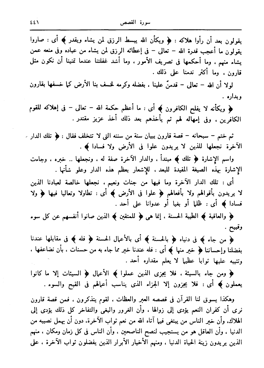 ثم ختم- سبحانه- قصة قارون ببيان سنة من سننه التي لا تتخلف فقال: تِلْكَ الدَّارُ الْآخِرَةُ نَجْعَلُها لِلَّذِينَ لا يُرِيدُونَ عُلُوًّا فِي الْأَرْضِ وَلا فَساداً.