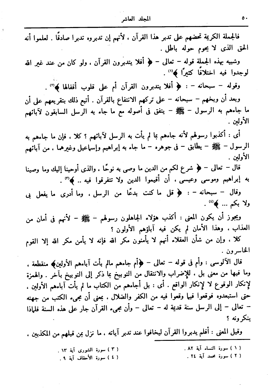 وقوله- سبحانه-: أَفَلا يَتَدَبَّرُونَ الْقُرْآنَ أَمْ عَلى قُلُوبٍ أَقْفالُها «2» .