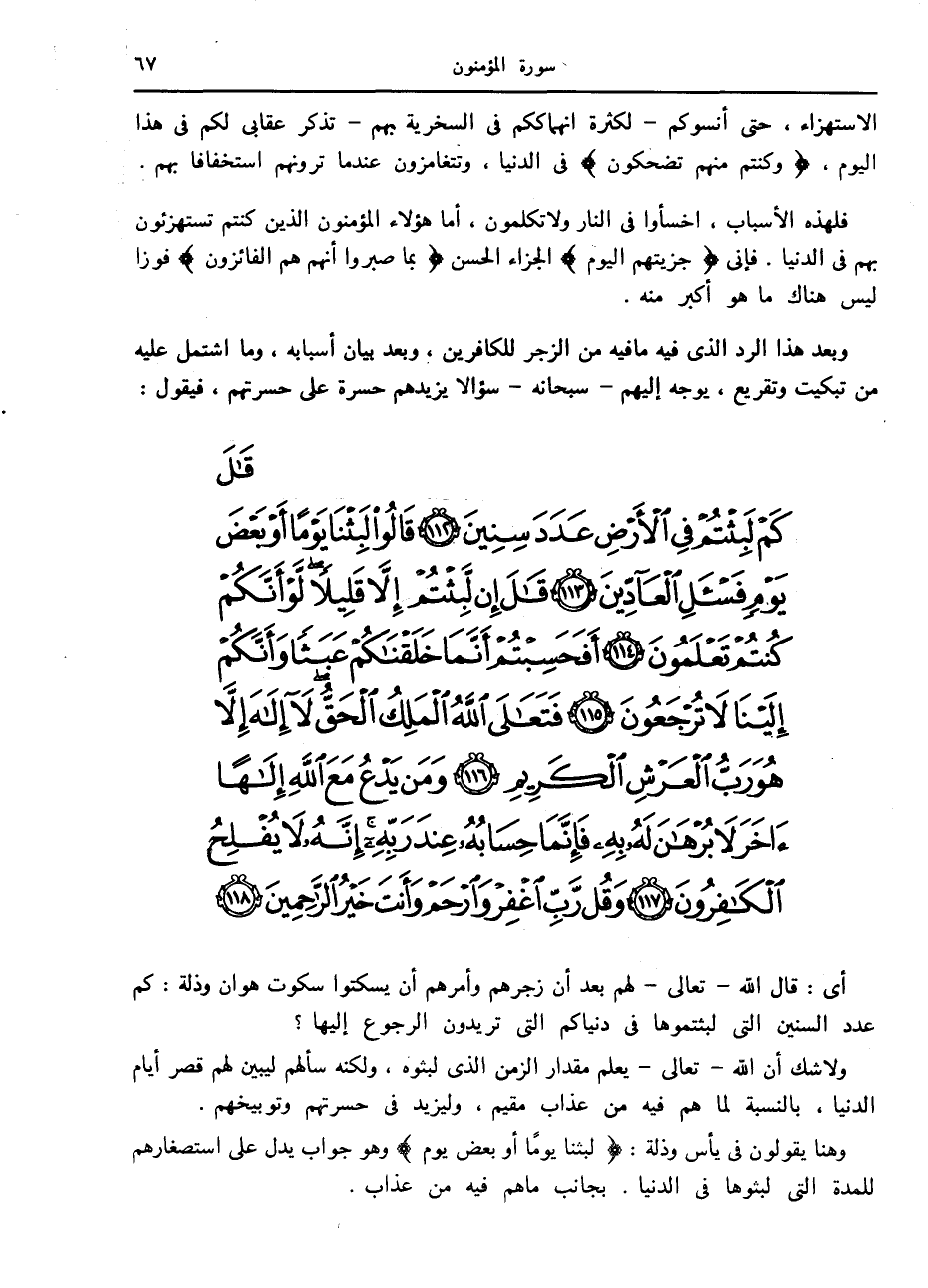 قالَ كَمْ لَبِثْتُمْ فِي الْأَرْضِ عَدَدَ سِنِينَ (112) قالُوا لَبِثْنا يَوْماً أَوْ بَعْضَ يَوْمٍ فَسْئَلِ الْعادِّينَ (113) قالَ إِنْ لَبِثْتُمْ إِلاَّ قَلِيلاً لَوْ أَنَّكُمْ كُنْتُمْ تَعْلَمُونَ (114) أَفَحَسِبْتُمْ أَنَّما خَلَقْناكُمْ عَبَثاً وَأَنَّكُمْ إِلَيْنا لا تُرْجَعُونَ (115) فَتَعالَى اللَّهُ الْمَلِكُ الْحَقُّ لا إِلهَ إِلاَّ هُوَ رَبُّ الْعَرْشِ الْكَرِيمِ (116)