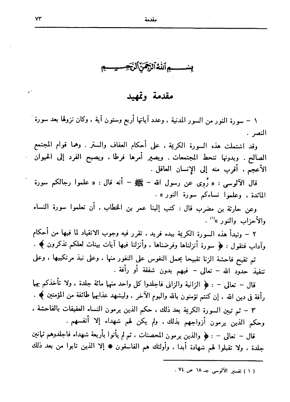 2- وتبدأ هذه السورة الكريمة ببدء فريد، تقرر فيه وجوب الانقياد لما فيها من أحكام وآداب فتقول: سُورَةٌ أَنْزَلْناها وَفَرَضْناها، وَأَنْزَلْنا فِيها آياتٍ بَيِّناتٍ لَعَلَّكُمْ تَذَكَّرُونَ.