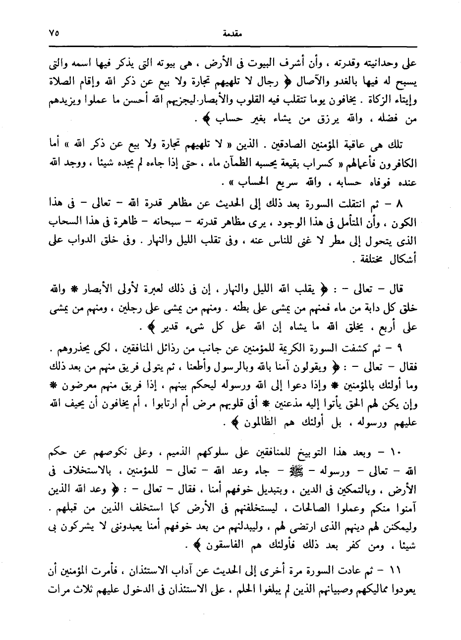 على وحدانيته وقدرته، وأن أشرف البيوت في الأرض، هي بيوته التي يذكر فيها اسمه والتي يسبح له فيها بالغدو والآصال رِجالٌ لا تُلْهِيهِمْ تِجارَةٌ وَلا بَيْعٌ عَنْ ذِكْرِ اللَّهِ وَإِقامِ الصَّلاةِ وَإِيتاءِ الزَّكاةِ. يَخافُونَ يَوْماً تَتَقَلَّبُ فِيهِ الْقُلُوبُ وَالْأَبْصارُ. لِيَجْزِيَهُمُ اللَّهُ أَحْسَنَ ما عَمِلُوا وَيَزِيدَهُمْ مِنْ فَضْلِهِ، وَاللَّهُ يَرْزُقُ مَنْ يَشاءُ بِغَيْرِ حِسابٍ.