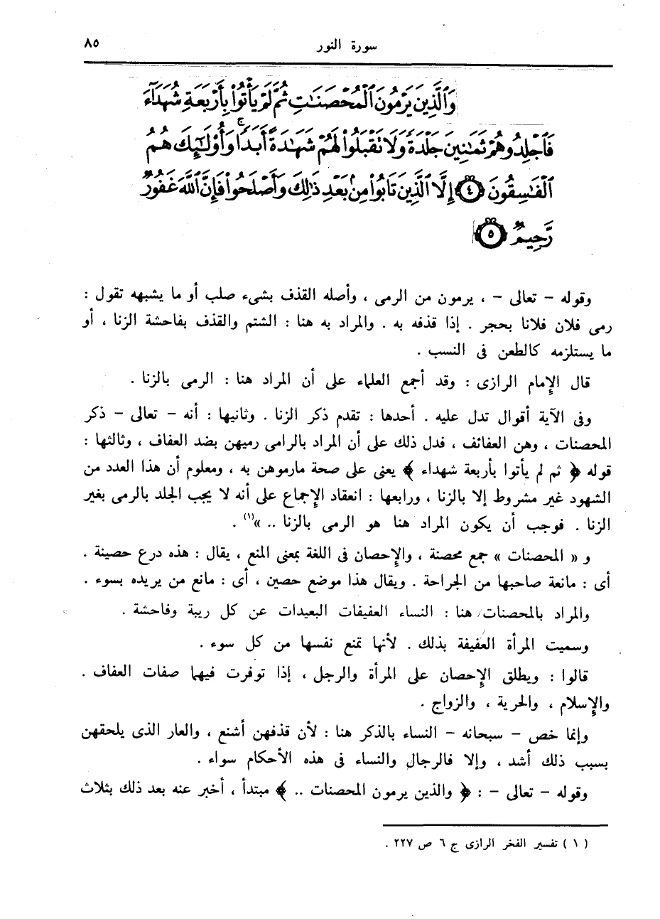 وَالَّذِينَ يَرْمُونَ الْمُحْصَناتِ ثُمَّ لَمْ يَأْتُوا بِأَرْبَعَةِ شُهَداءَ فَاجْلِدُوهُمْ ثَمانِينَ جَلْدَةً وَلا تَقْبَلُوا لَهُمْ شَهادَةً أَبَداً وَأُولئِكَ هُمُ الْفاسِقُونَ (4) إِلاَّ الَّذِينَ تابُوا مِنْ بَعْدِ ذلِكَ وَأَصْلَحُوا فَإِنَّ اللَّهَ غَفُورٌ رَحِيمٌ (5)