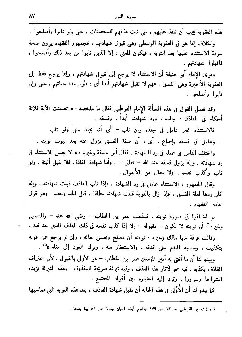 واختلف الناس في عمله في رد الشهادة. فقال أبو حنيفة وغيره: «لا يعمل الاستثناء في رد شهادته. وإنما يزول فسقه عند الله- تعالى-. وأما شهادة القاذف فلا تقبل ألبتة. ولو تاب وأكذب نفسه، ولا بحال من الأحوال.