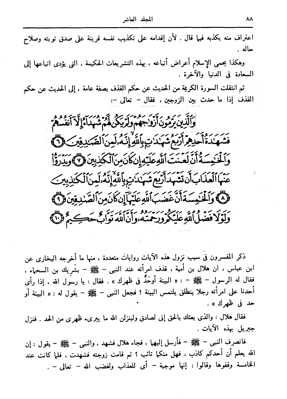 وَالَّذِينَ يَرْمُونَ أَزْواجَهُمْ وَلَمْ يَكُنْ لَهُمْ شُهَداءُ إِلاَّ أَنْفُسُهُمْ فَشَهادَةُ أَحَدِهِمْ أَرْبَعُ شَهاداتٍ بِاللَّهِ إِنَّهُ لَمِنَ الصَّادِقِينَ (6) وَالْخامِسَةُ أَنَّ لَعْنَتَ اللَّهِ عَلَيْهِ إِنْ كانَ مِنَ الْكاذِبِينَ (7) وَيَدْرَؤُا عَنْهَا الْعَذابَ أَنْ تَشْهَدَ أَرْبَعَ شَهاداتٍ بِاللَّهِ إِنَّهُ لَمِنَ الْكاذِبِينَ (8) وَالْخامِسَةَ أَنَّ غَضَبَ اللَّهِ عَلَيْها إِنْ كانَ مِنَ الصَّادِقِينَ (9) وَلَوْلا فَضْلُ اللَّهِ عَلَيْكُمْ وَرَحْمَتُهُ وَأَنَّ اللَّهَ تَوَّابٌ حَكِيمٌ (10)