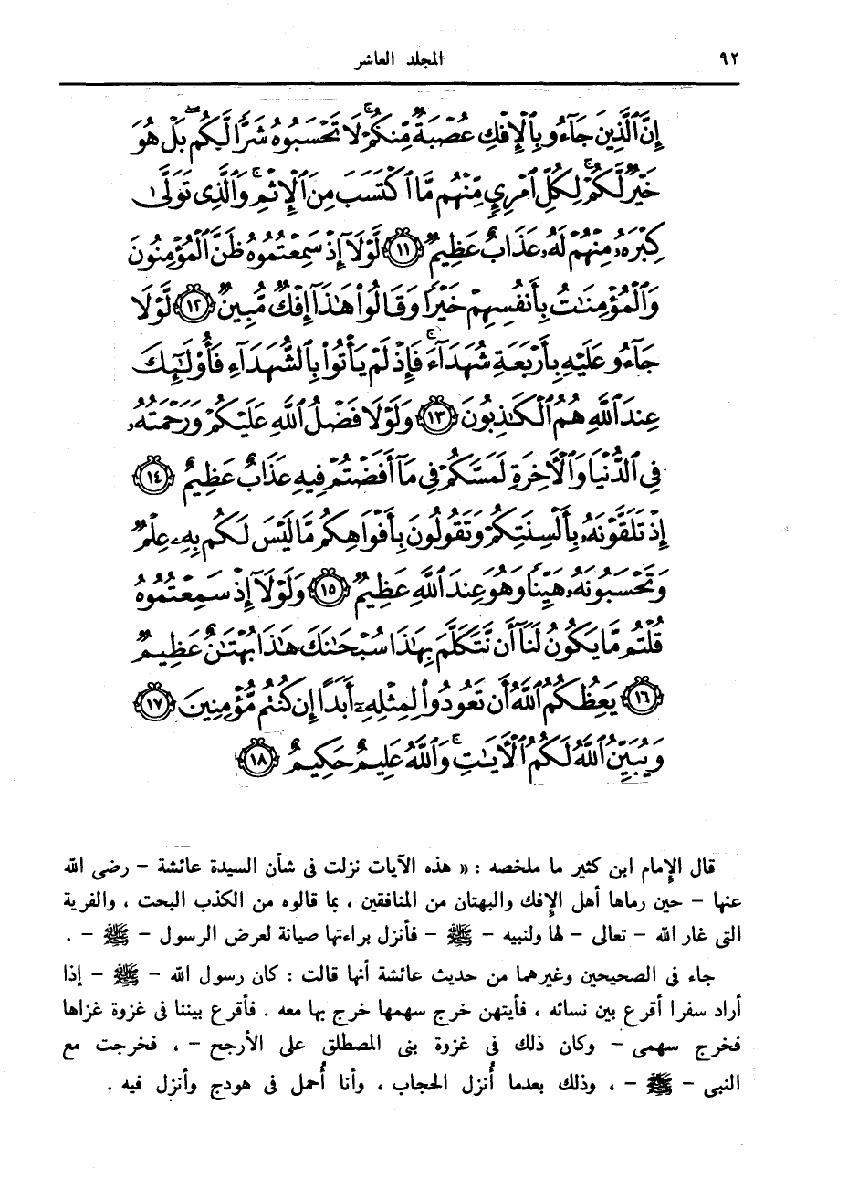 إِنَّ الَّذِينَ جاؤُ بِالْإِفْكِ عُصْبَةٌ مِنْكُمْ لا تَحْسَبُوهُ شَرًّا لَكُمْ بَلْ هُوَ خَيْرٌ لَكُمْ لِكُلِّ امْرِئٍ مِنْهُمْ مَا اكْتَسَبَ مِنَ الْإِثْمِ وَالَّذِي تَوَلَّى كِبْرَهُ مِنْهُمْ لَهُ عَذابٌ عَظِيمٌ (11) لَوْلا إِذْ سَمِعْتُمُوهُ ظَنَّ الْمُؤْمِنُونَ وَالْمُؤْمِناتُ بِأَنْفُسِهِمْ خَيْراً وَقالُوا هذا إِفْكٌ مُبِينٌ (12) لَوْلا جاؤُ عَلَيْهِ بِأَرْبَعَةِ شُهَداءَ فَإِذْ لَمْ يَأْتُوا بِالشُّهَداءِ فَأُولئِكَ عِنْدَ اللَّهِ هُمُ الْكاذِبُونَ (13) وَلَوْلا فَضْلُ اللَّهِ عَلَيْكُمْ وَرَحْمَتُهُ فِي الدُّنْيا وَالْآخِرَةِ لَمَسَّكُمْ فِيما أَفَضْتُمْ فِيهِ عَذابٌ عَظِيمٌ (14) إِذْ تَلَقَّوْنَهُ بِأَلْسِنَتِكُمْ وَتَقُولُونَ بِأَفْواهِكُمْ ما لَيْسَ لَكُمْ بِهِ عِلْمٌ وَتَحْسَبُونَهُ هَيِّناً وَهُوَ عِنْدَ اللَّهِ عَظِيمٌ (15)